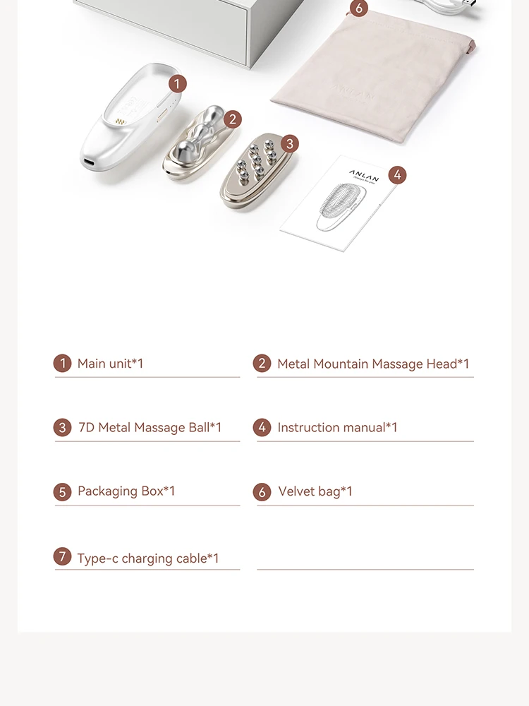 4. 2 Pro Massage Heads for Targeted Care: Metal Mountain Head (hot/cold), 7D Ball Head (purple light/EMS).